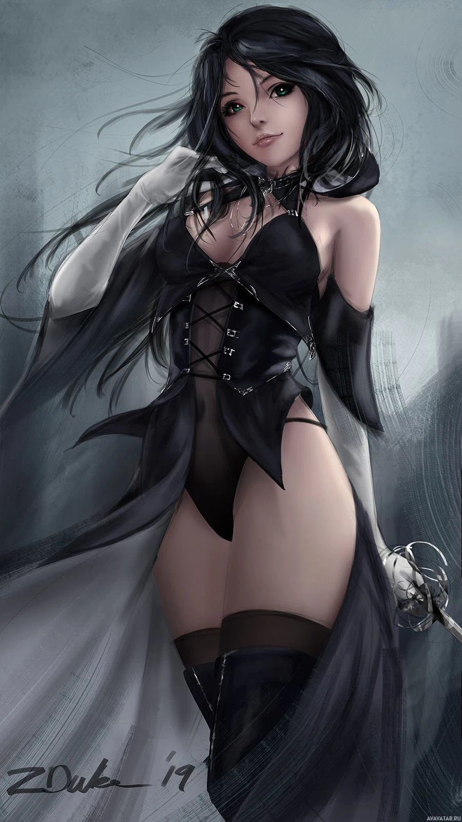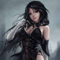 На картинке изображен анимационный персонаж, который выглядит как девушка с темными волосами. Она одета в наряд, напоминающий фэнтезийный или готический стиль, дополненный накидкой и элементами, которые могут указывать на демоническую или сверхъестественную тематику. Фон создает мрачную атмосферу, которая дополняет общую эстетику изображения.