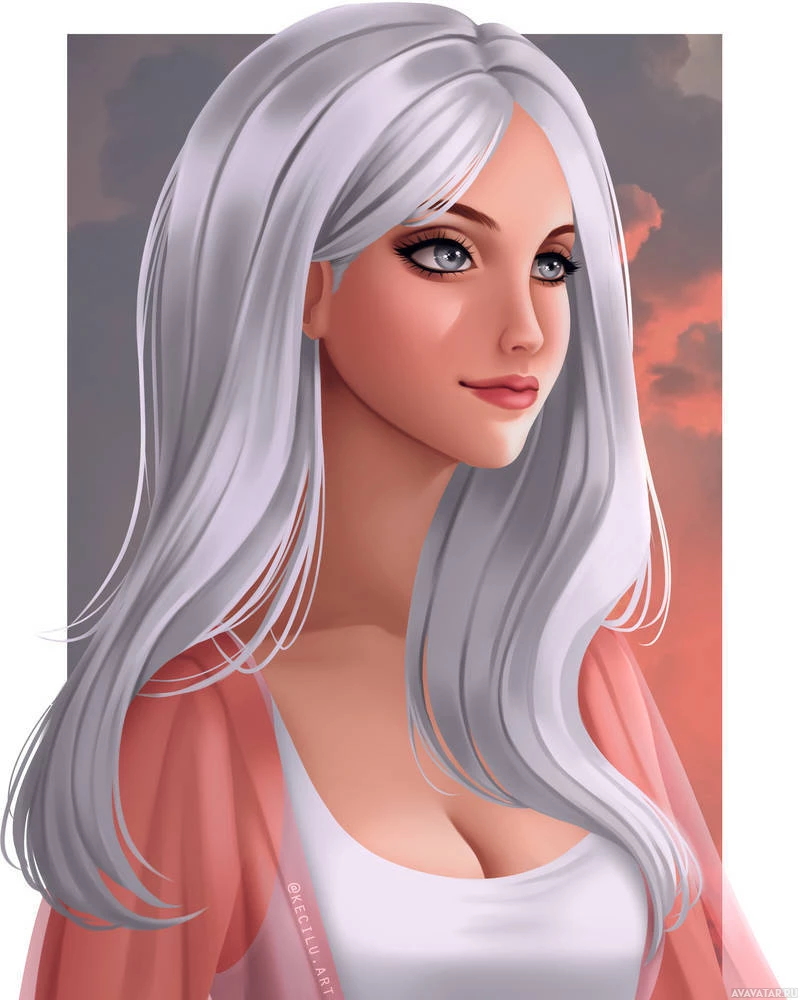 white hair and blue eyes. She appears to be wearing makeup, including eyeliner and lipstick, which gives her a somewhat sophisticated or adult appearance despite her
