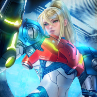 The image features a character dressed in futuristic armor, which is reminiscent of the suit worn by Samus Aran from the "Metroid"