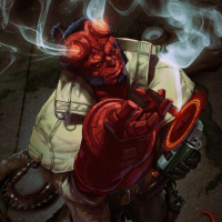 The image features a character that resembles Hellboy, a popular comic