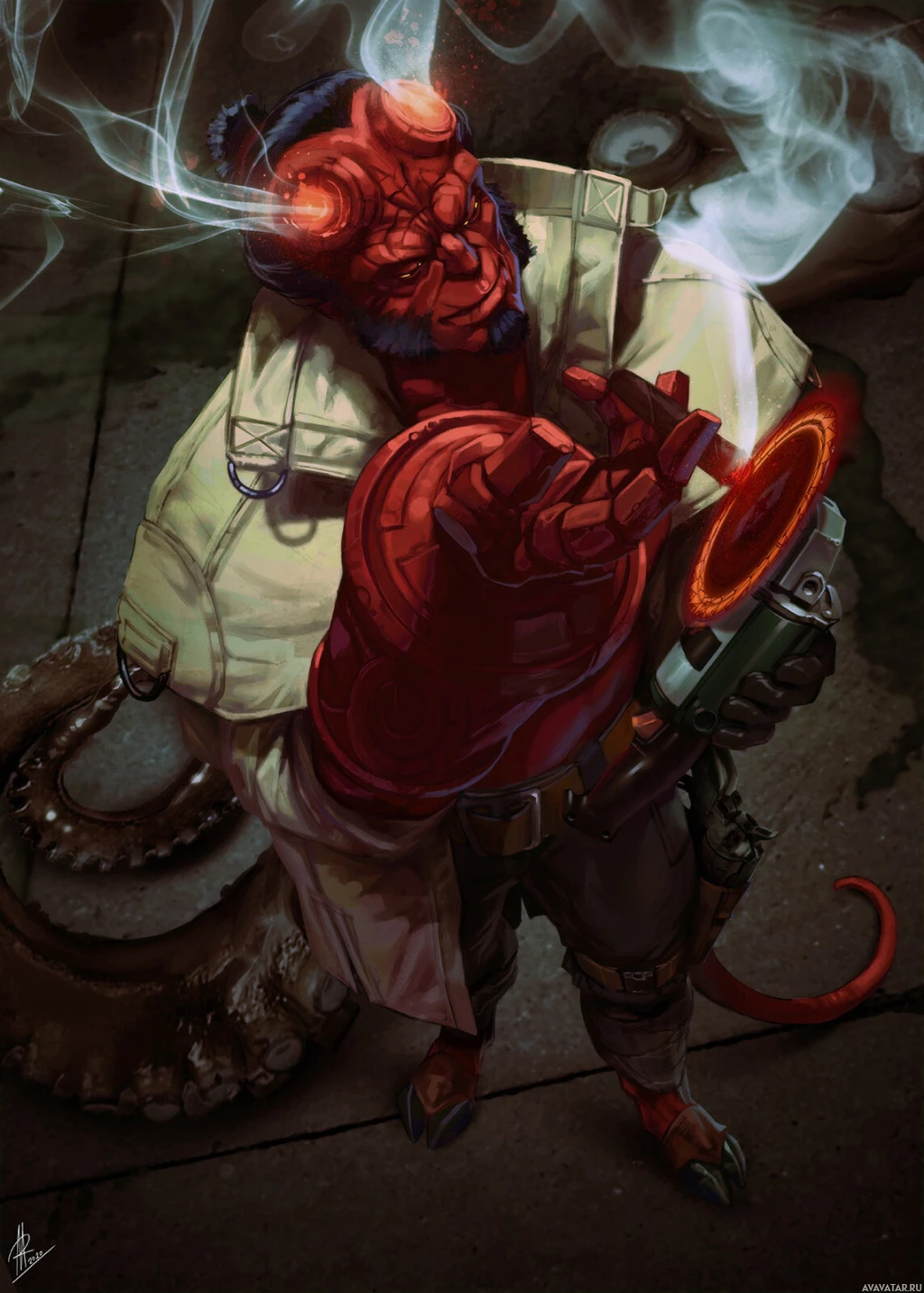 industrial setting, which is typical for Hellboy's adventures. The artist has signed their work on the lower right corner of the image.