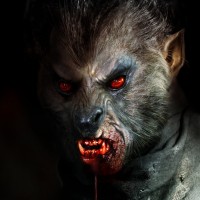 The image depicts a fantastical and horrific scene. There is a figure that appears to be a werewolf with prominent wolf-like features, such as