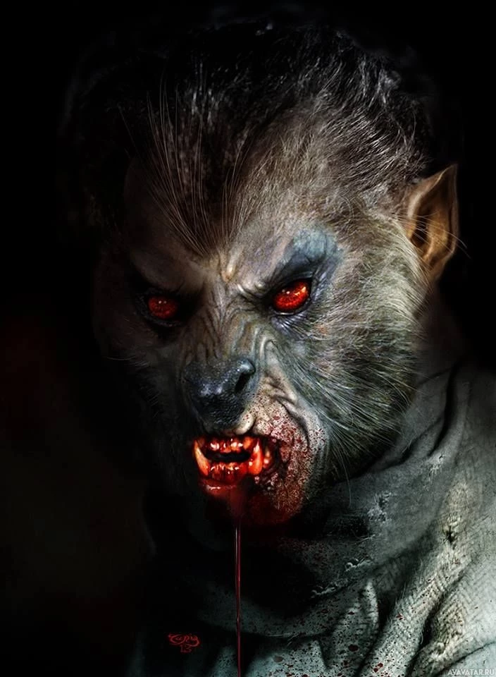 large teeth and claws. Its eyes are glowing red, which often indicates an aggressive or predatory state in mythology or folklore. The creature has blood around its mouth, suggesting it may have been involved in violence or feeding on another being. It's set against