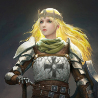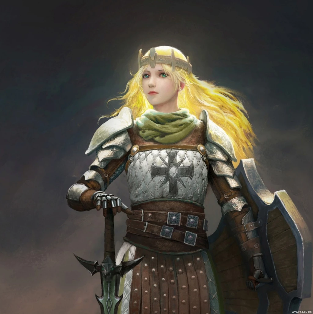 a dark background that contrasts with her golden hair and the metallic armor, enhancing her presence in the image.