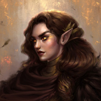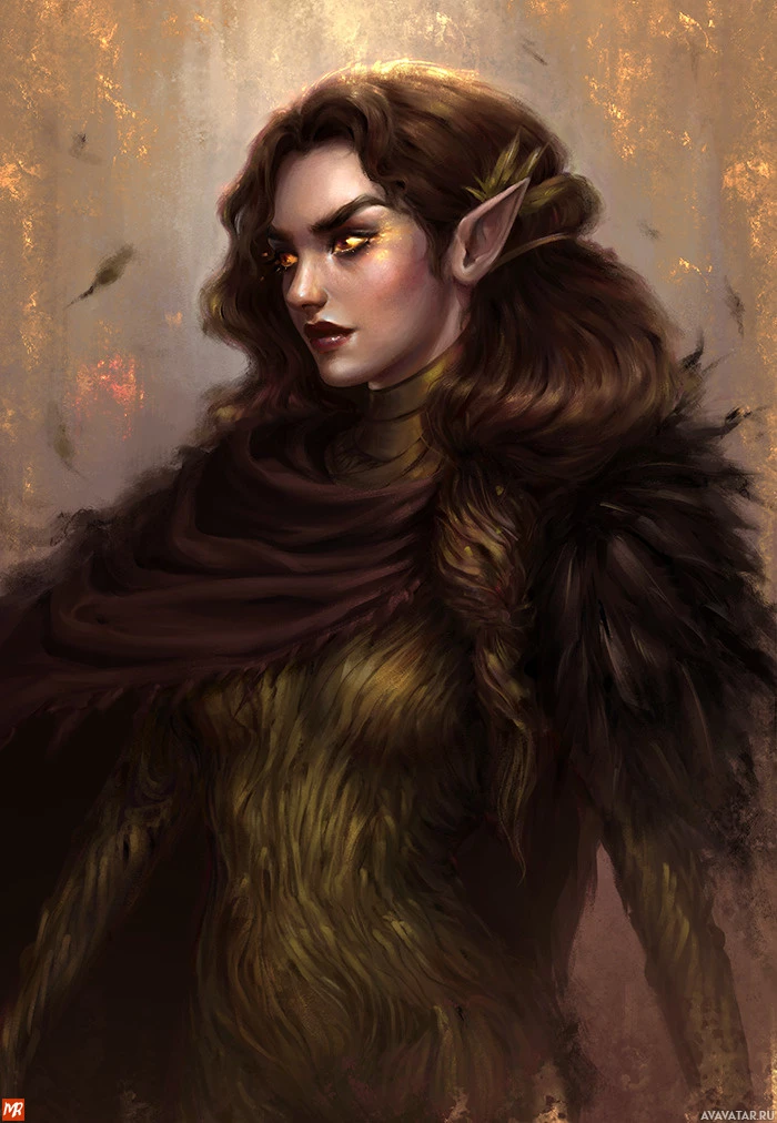 golden accents, suggesting she might be royalty or of high status within her context. Her attire is ornate, featuring plumage and gold embellishments, indicating a culture or race that values finery and status. The artwork itself is highly detailed, with a muted color palette that gives it an ancient or mystical atmosphere.