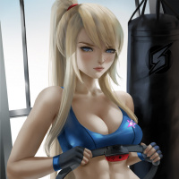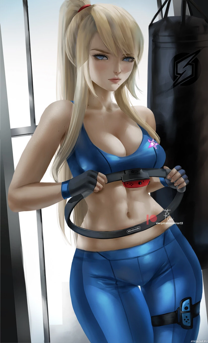 a female character with blonde hair wearing a blue and black athletic outfit, which resembles the suit worn by Samus Aran from the "Metroid" video game series. She is also wearing gloves and appears to be in a gym or fitness-related setting, as there's a punching bag and weightlifting