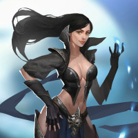 dark hair and is wearing a black outfit with what appears to be armor pieces, such as a chest plate and gloves. The character also has a scarf or cape that seems to have a blue color with