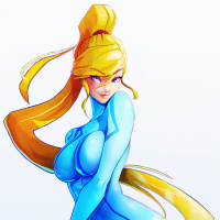 The image depicts an illustration of Samus Aran, a character from the "Metroid"