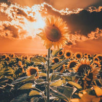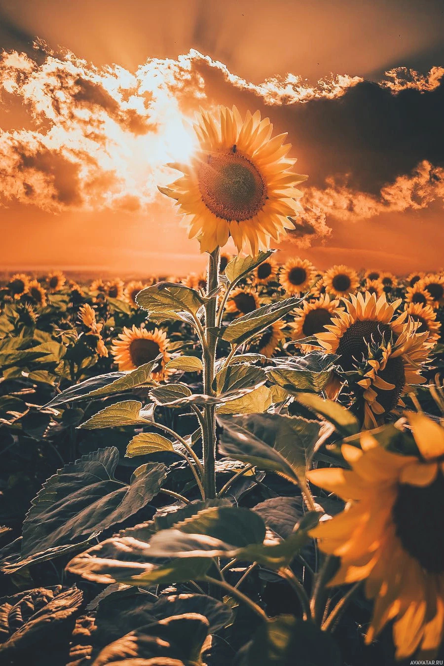 The picture depicts a sunflower field during what appears to be either sunrise or sunset, given