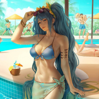 female character with turquoise hair wearing a bikini and sitting on the edge of a swimming pool. She is accessorized with jewelry, including what appears to be a necklace or bracelet, and is holding sunglasses above her head. The character has an animated look with large expressive eyes that suggest she may be from
