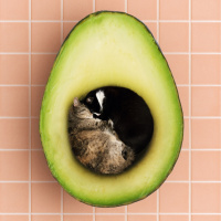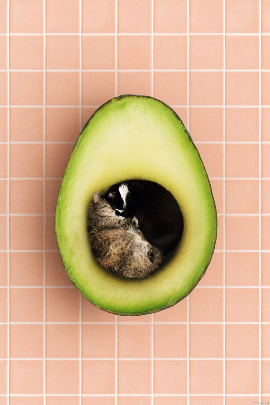 На картинке изображен авокадо с дырочкой. Внутри этой дырочки находится спящий котенок. Фоном изображения служит бумага в розовую и белую клетку с рисунком или аналогичная декоративная поверхность.