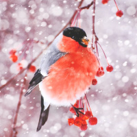 The image features a small bird, possibly a bullfinch or another type of finch, perched on