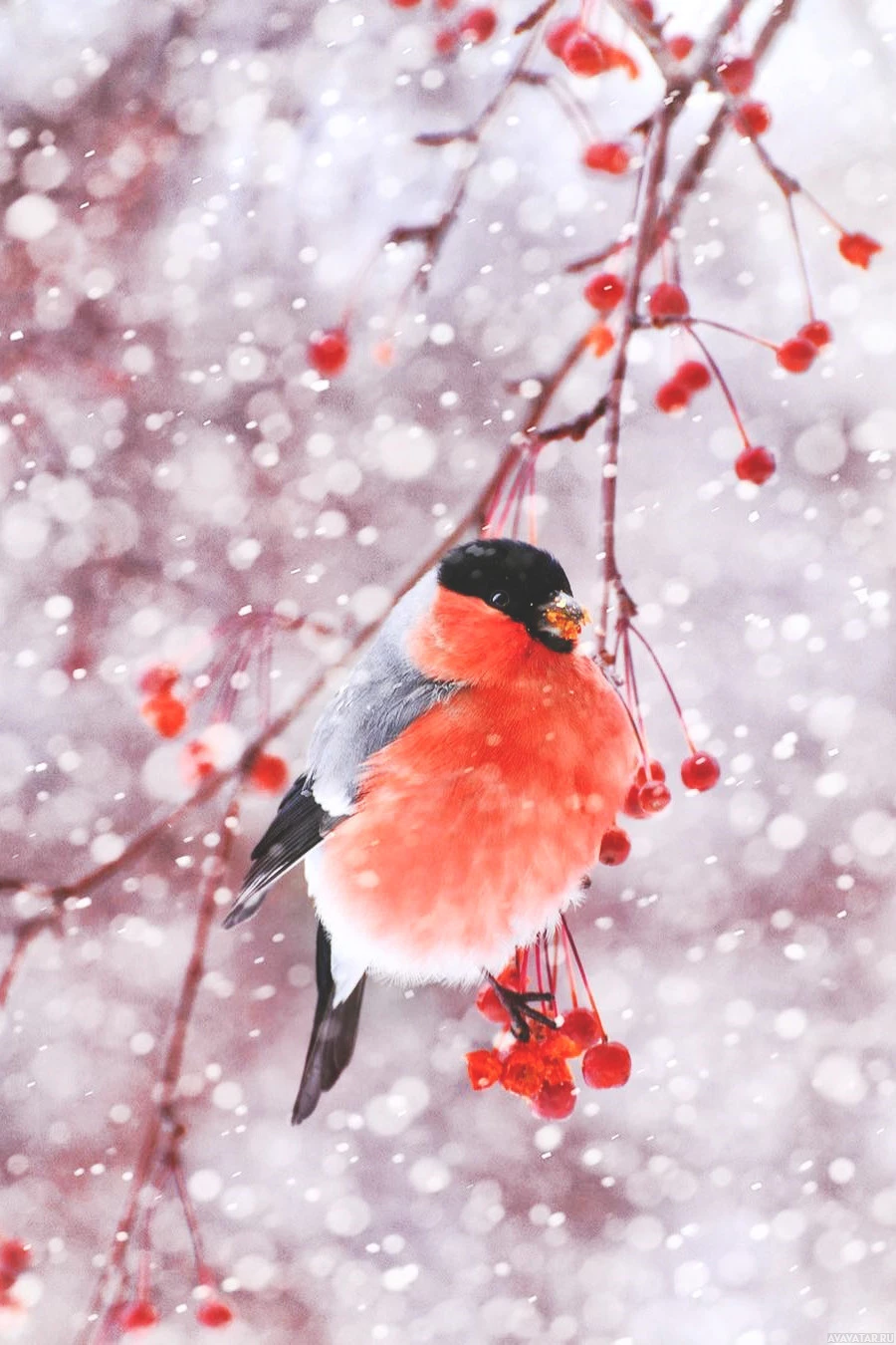a tree branch. The background is filled with snowflakes falling from the sky, creating