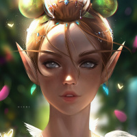 enchanting atmosphere of the image. The character's expression is gentle and content, with