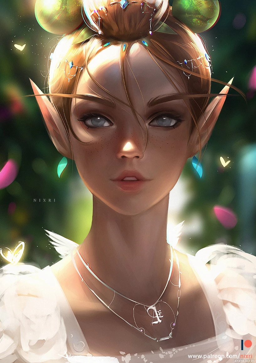 pointed ears and the presence of magical elements around her head. Her attire suggests a formal or elegant setting, possibly a wedding or