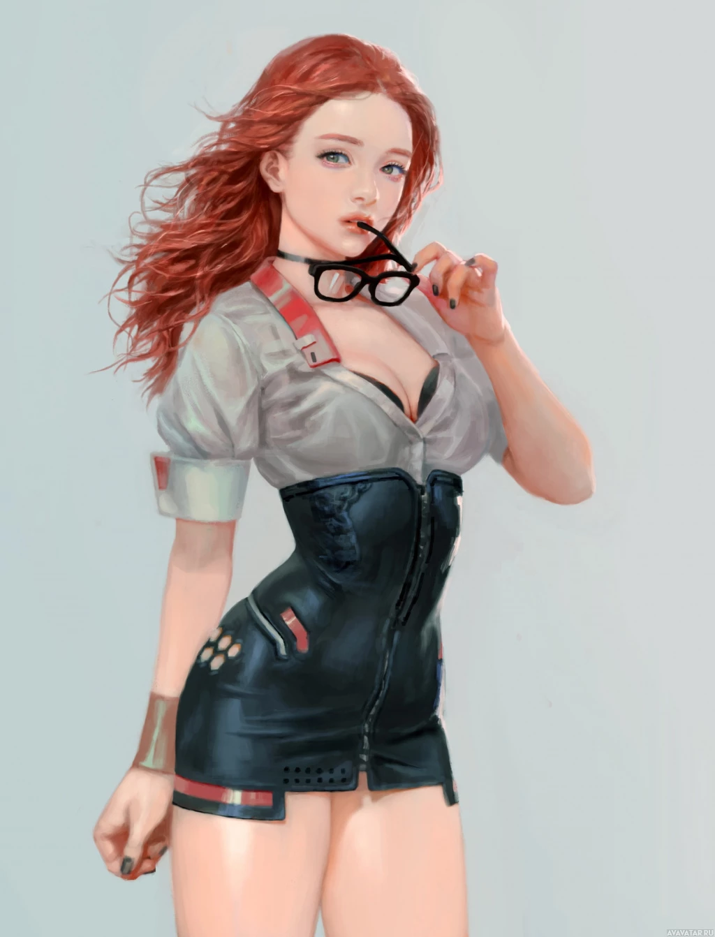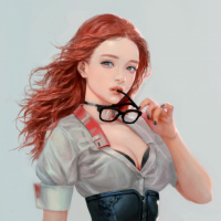 red hair, wearing glasses and a costume that appears to be inspired by a mechanic or technician outfit. She is also wearing