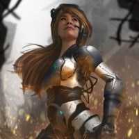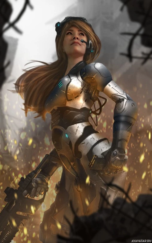 combat gear. She is standing amidst what looks like destruction or battlefield debris, suggesting she might be part of an action-oriented setting, perhaps related to