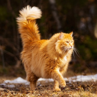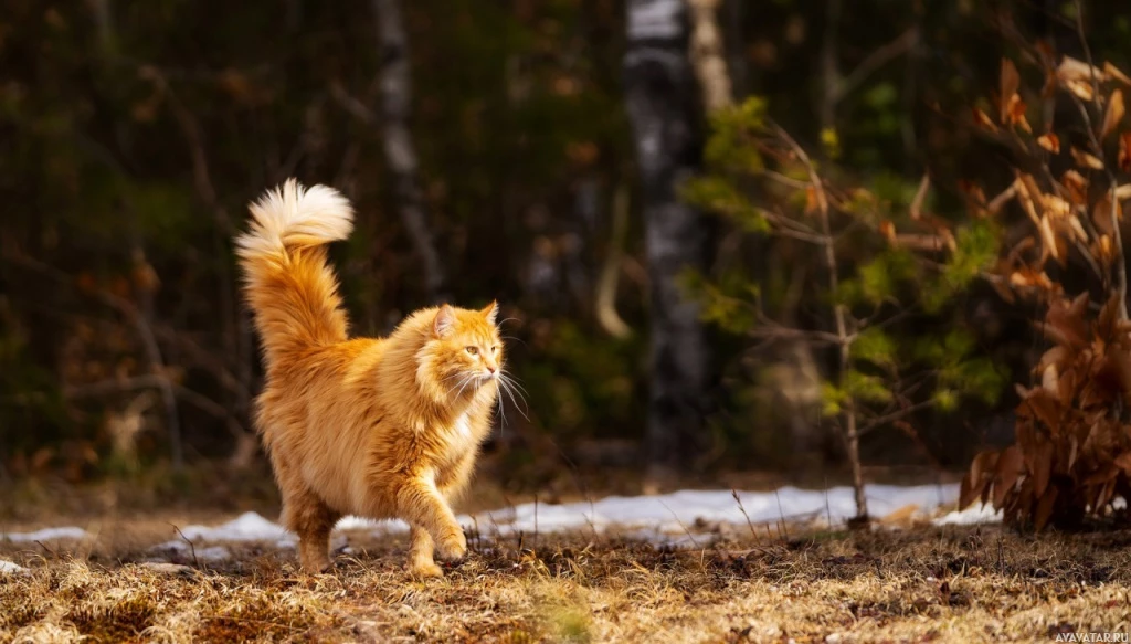 The image features an orange tabby cat with a prominent tail, running or walking through what appears to be