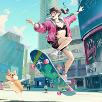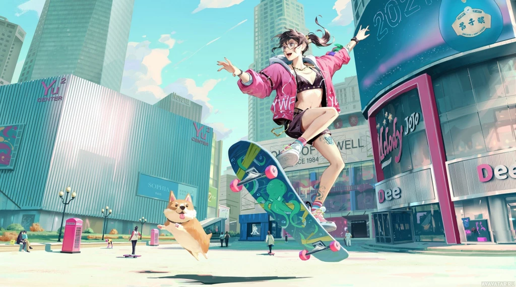 a small cat depicted in mid-jump behind the skateboarder, adding to the dynamic and lively feel of the scene. The overall tone of the image is energetic and fun, suggesting an urban environment where the character enjoys skateboarding.