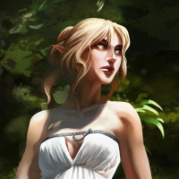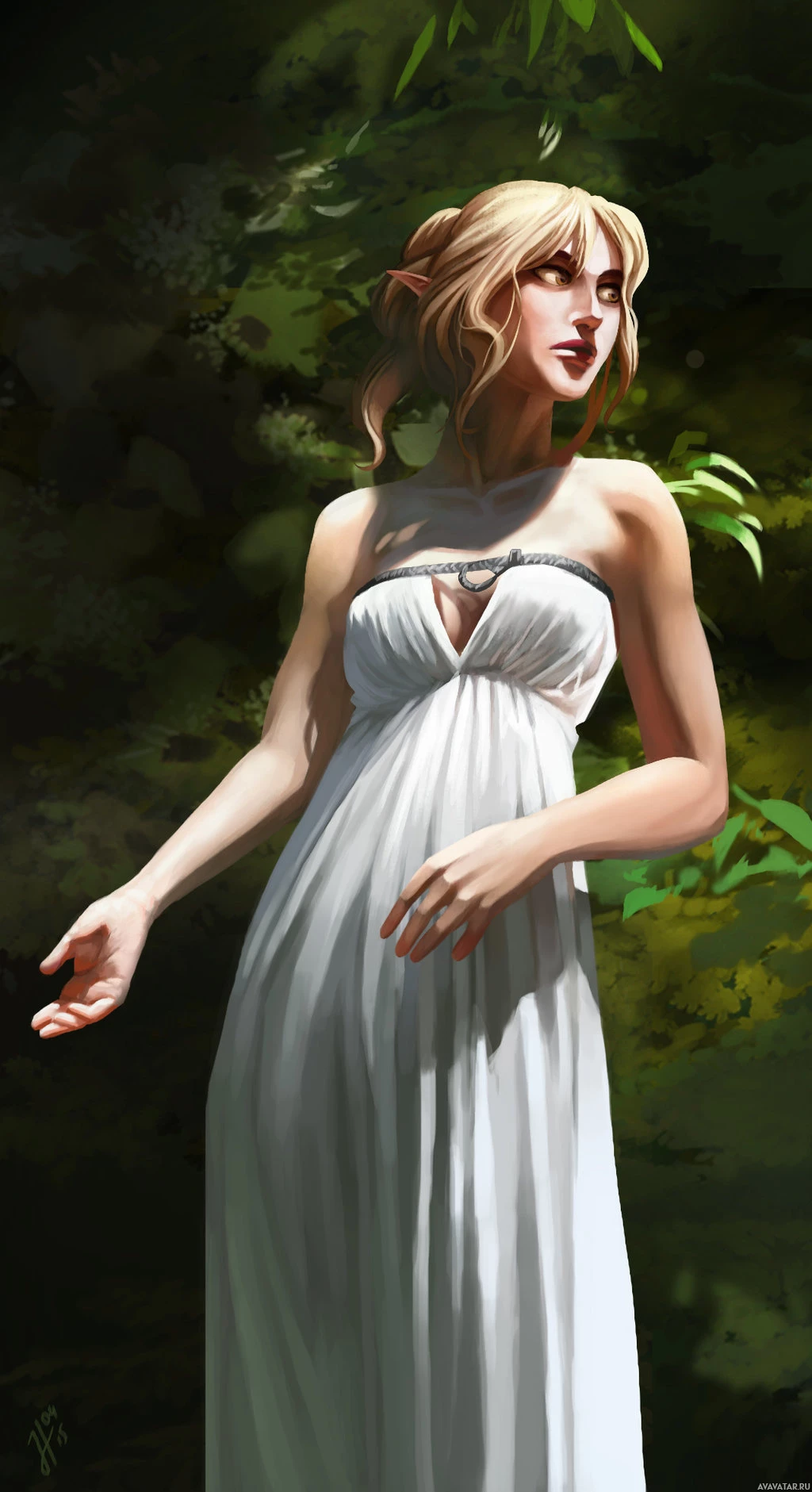 a female character with elven features, standing in what appears to be a forest or natural setting. She has long