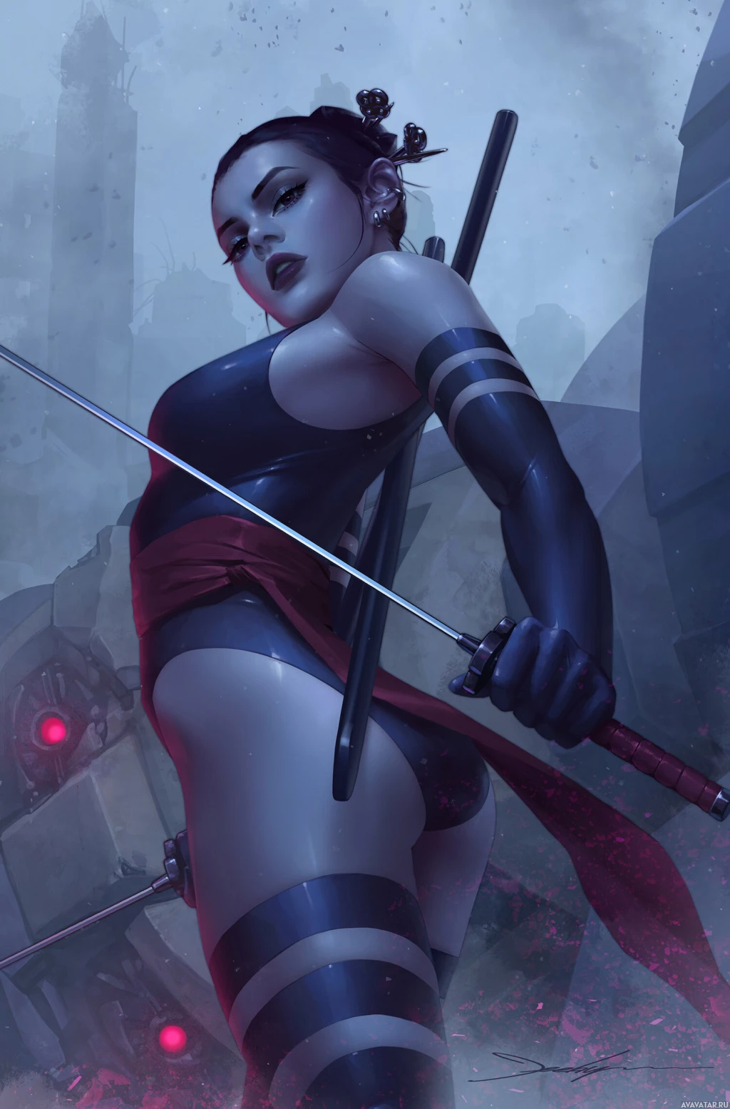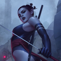 dark hair and is wearing a black, skin-tight bodysuit with red accents that could be a part of her armor or costume. In her hands, she holds two swords crossed in front of her body, ready for combat. The background suggests a dramatic or action-oriented setting, possibly indicating that she is in