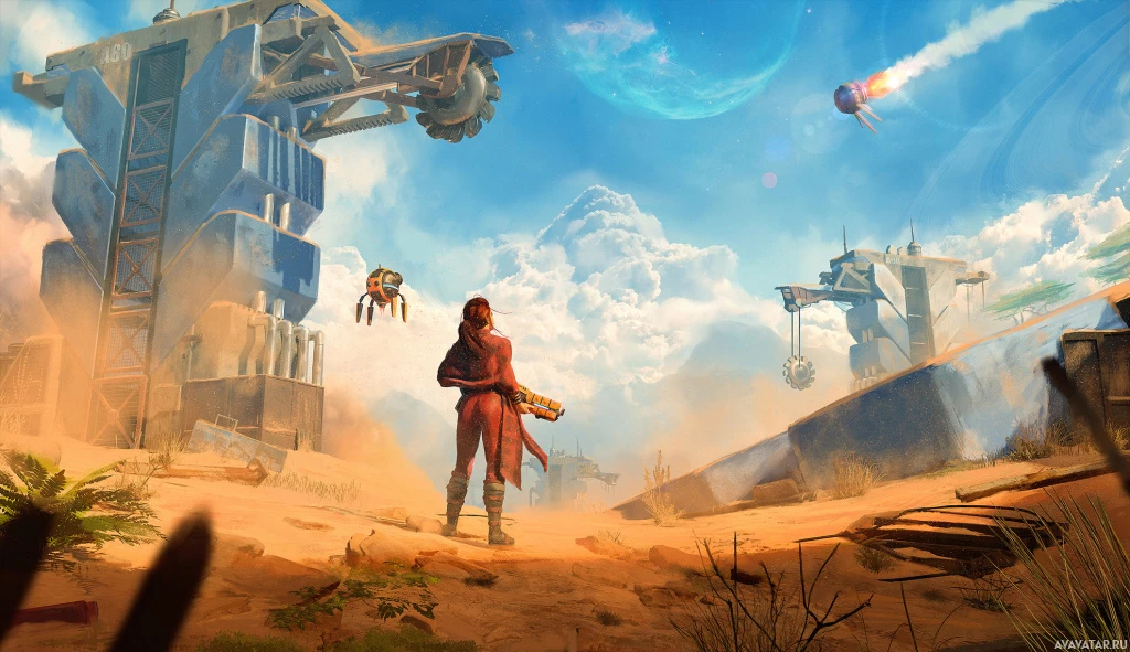 a video game or similar interactive media. There is also a drone or flying