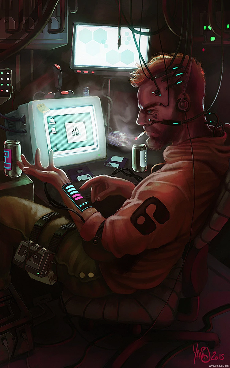 a science fiction setting. He is wearing a headset and seems to be engrossed in his work on the computer. Behind him, there are multiple screens displaying various data or graphics that suggest