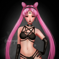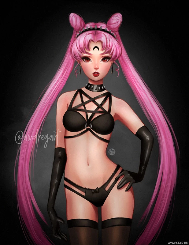 animated character with pink hair and cat-like ears on top of her head. She is wearing a black bralette,