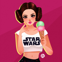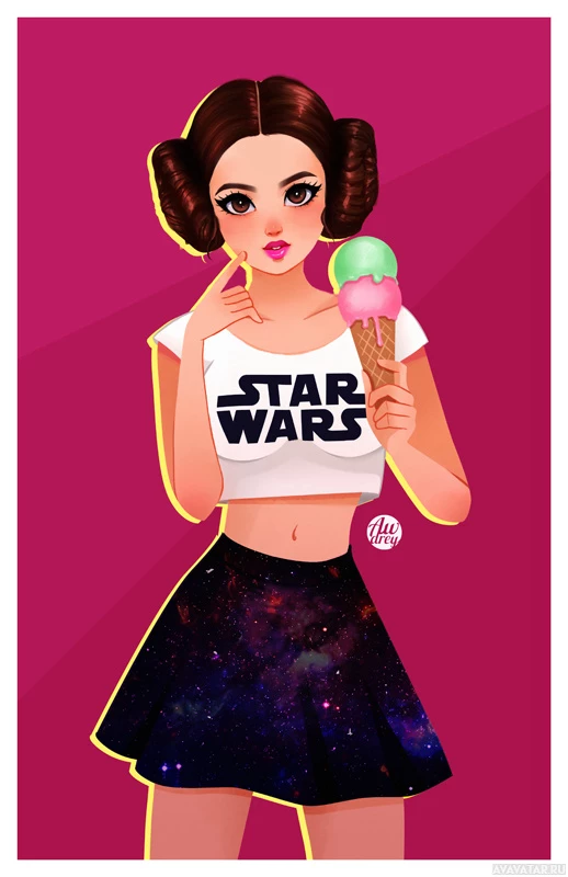 Star Wars" written on it, paired with a dark skirt and boots that have a galaxy print on them. The character has her hair styled in twin tails with