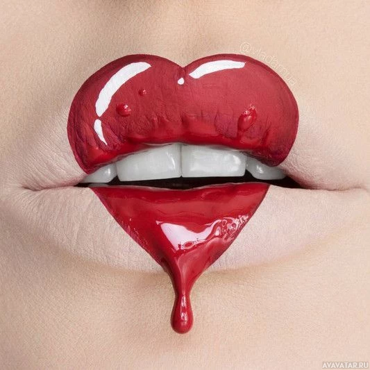На картинке изображена пара губ с красной помадой на них. Также есть маленькая деталь в форме сердца, которая, кажется, стекает по нижней губе, придавая ей глянцевый вид, как будто помада еще не высохла после нанесения.