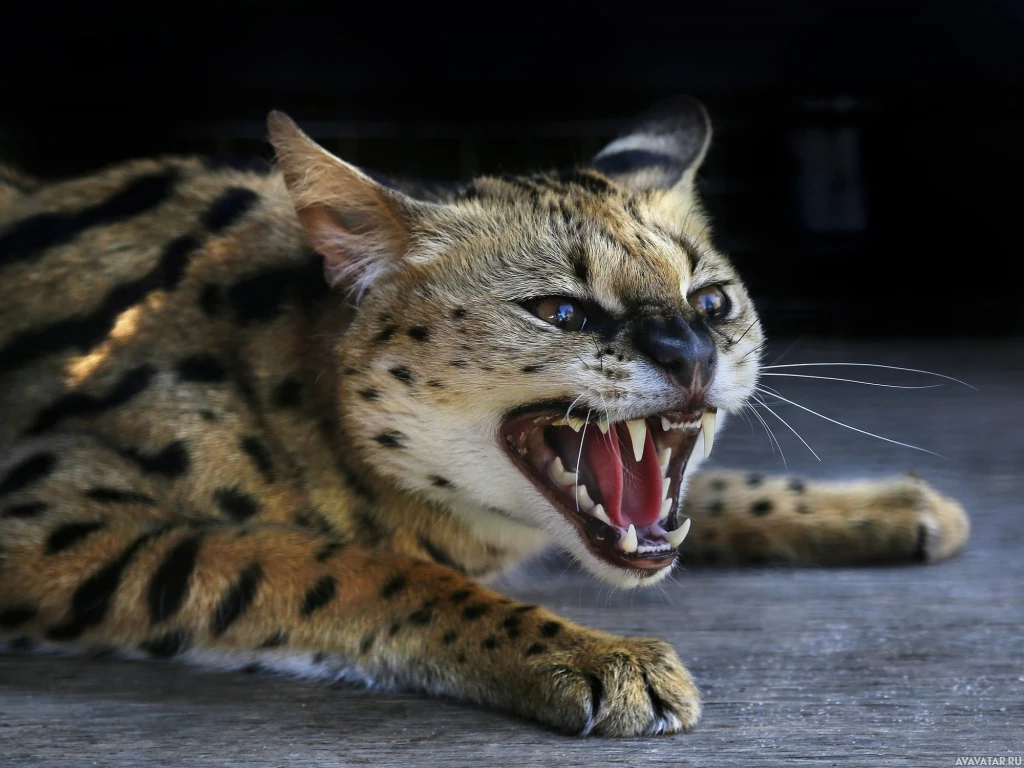 a wild cat, specifically an Asiatic leopard (also known as the Amur or Far Eastern leopard), lying on what appears to be a concrete surface. The cat is displaying an open-