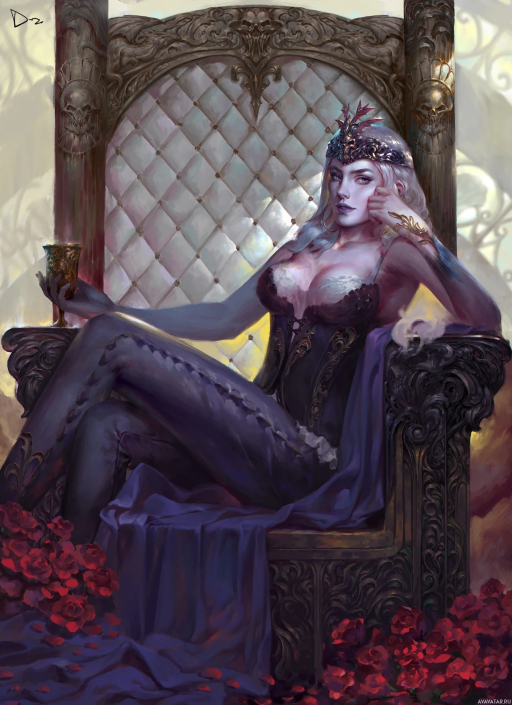 white hair and is sitting on a throne, with red roses at her feet. The character appears to be in a regal or mystical pose, possibly portraying a queen or a powerful figure within