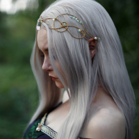 The image depicts a character with white hair and what appears to be an elf-like appearance. This character is wearing what seems to be a fantasy or fairy tale-inspired outfit, suggesting that the setting might be from a fantasy story or a role in a fantasy-themed film or television show. The character is looking down with a contemplative expression.