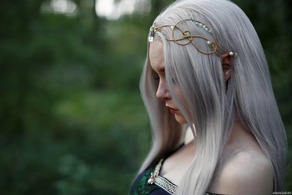 На картинке изображен персонаж с белыми волосами и внешностью, похожей на внешность эльфа. Этот персонаж одет в одежду, напоминающую фэнтезийную или сказочную, что наводит на мысль о том, что место действия может быть из фантастической истории или роли в фантастическом фильме или телешоу. Персонаж смотрит вниз с задумчивым выражением лица.