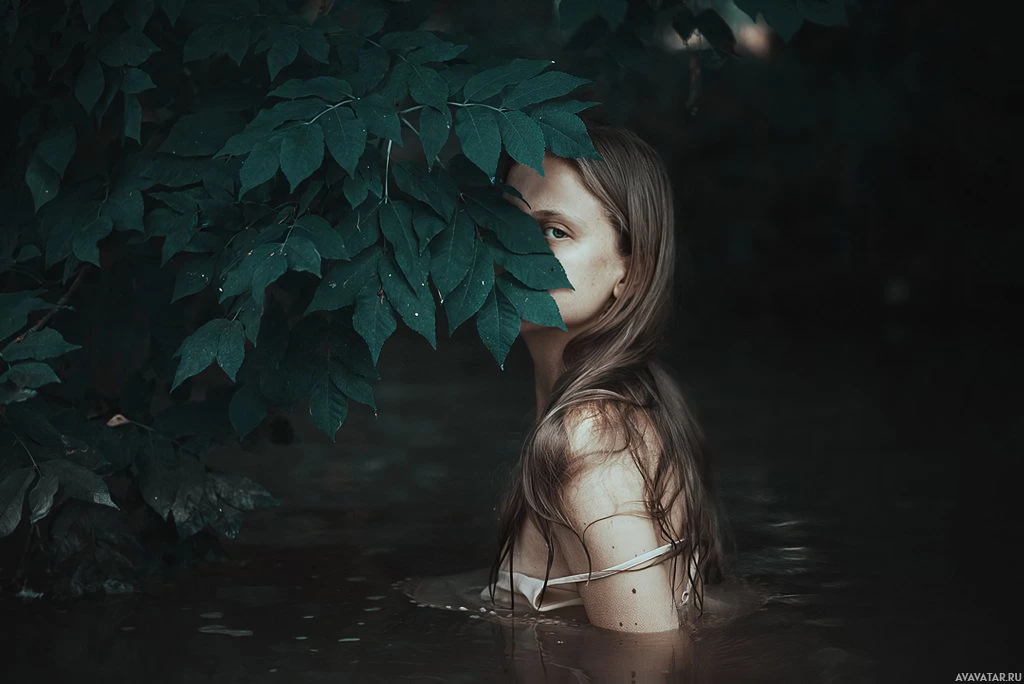 На картинке изображена женщина, сидящая в воде, вероятно, до пояса. У нее длинные волосы и она отворачивается от зрителя. Листья частично покрывают ее лицо, когда она сидит среди растительности. Ее поза предполагает созерцание или расслабление в этой естественной обстановке.