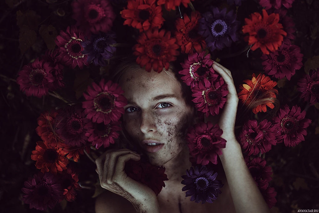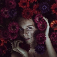 light skin, and her eyes are looking directly at the camera. Her expression is calm and serene. The background behind her head seems to be darker, suggesting that this scene may be taking place in