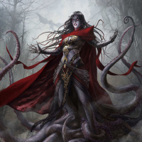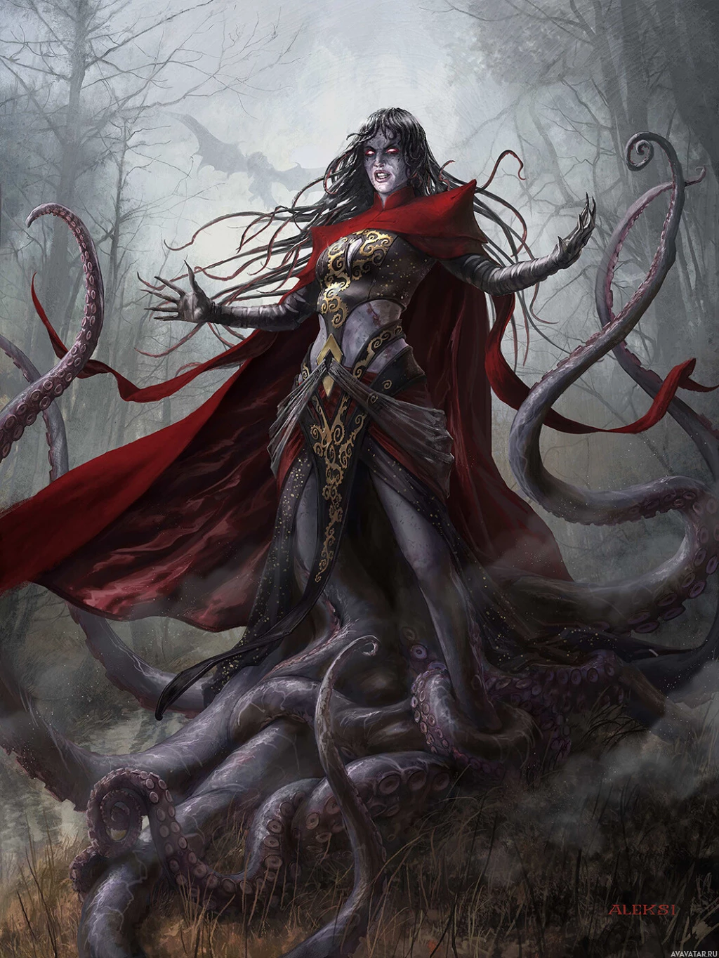 long hair and is adorned with what looks like tentacles, suggesting an octopus-like appearance blended with humanoid traits. They are dressed in a cloak that matches the color of the tentacles, which are spread out around them, adding to
