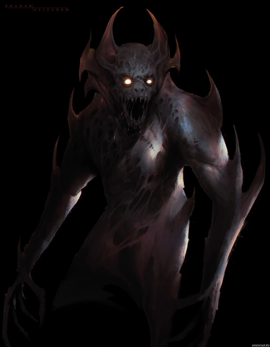 На картинке изображен монстр с элементами хоррора. У него острые зубы, красные глаза, которые наводят на мысль о злобе или безумии, и в целом угрожающий внешний вид. Это существо не человек, а скорее некое демоническое или злобно настроенное существо.