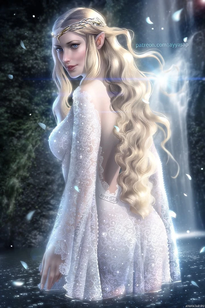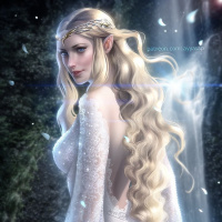 a dramatic feel to it, possibly indicating she is portraying a significant role in the story, which might be reminiscent of Galadriel's character from J.R.R. Tolkien's "The
