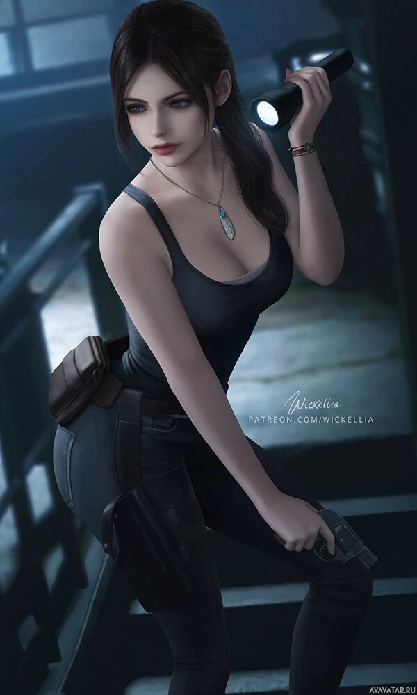 dark hair and is holding a flashlight in her right hand, which she seems to be using as a source of light in a dimly lit environment. The character is wearing what looks like