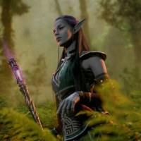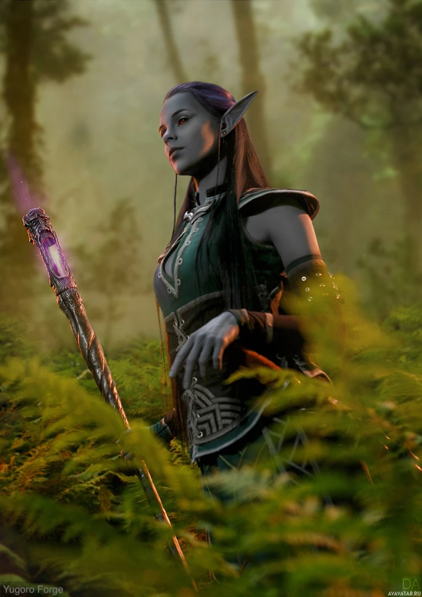 a female character from the fantasy genre, known as "drow." She is standing in