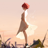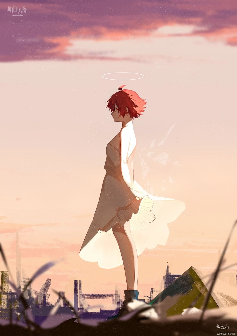 red hair, standing in a dress. She appears to be walking towards the viewer or looking out over a landscape that could be described as dilapidated or post-apocalyptic. There is a hint of light at the horizon, suggesting either sunrise or sunset. The overall tone of the picture seems to convey