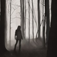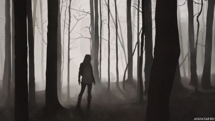 a silhouette of a girl walking through a foggy forest. The scene is composed with multiple layers, giving it
