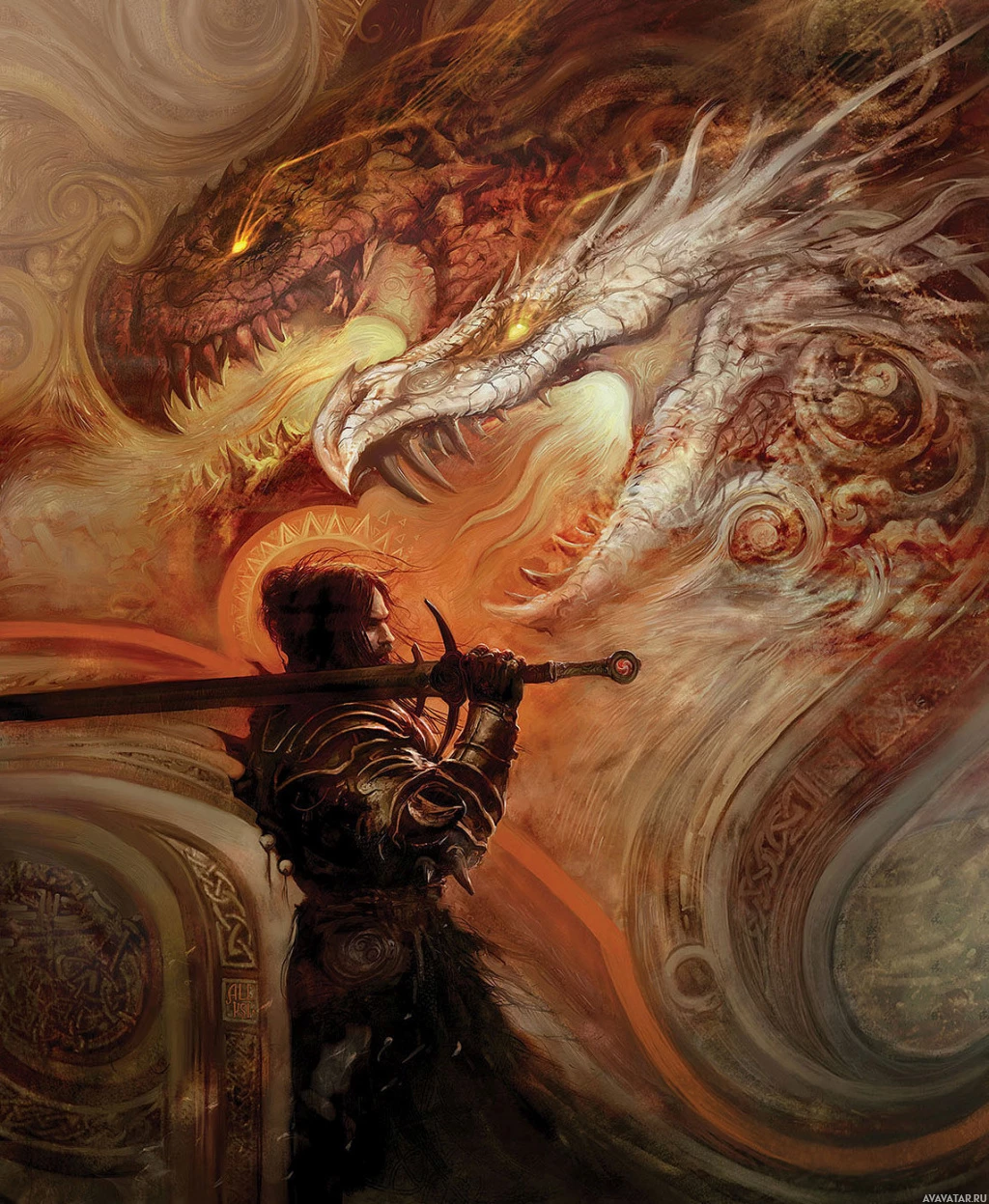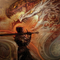 a fantasy scene featuring a warrior in armor standing against a backdrop that seems to be a battlefield. In front of the warrior, there is a large dragon with