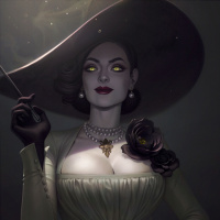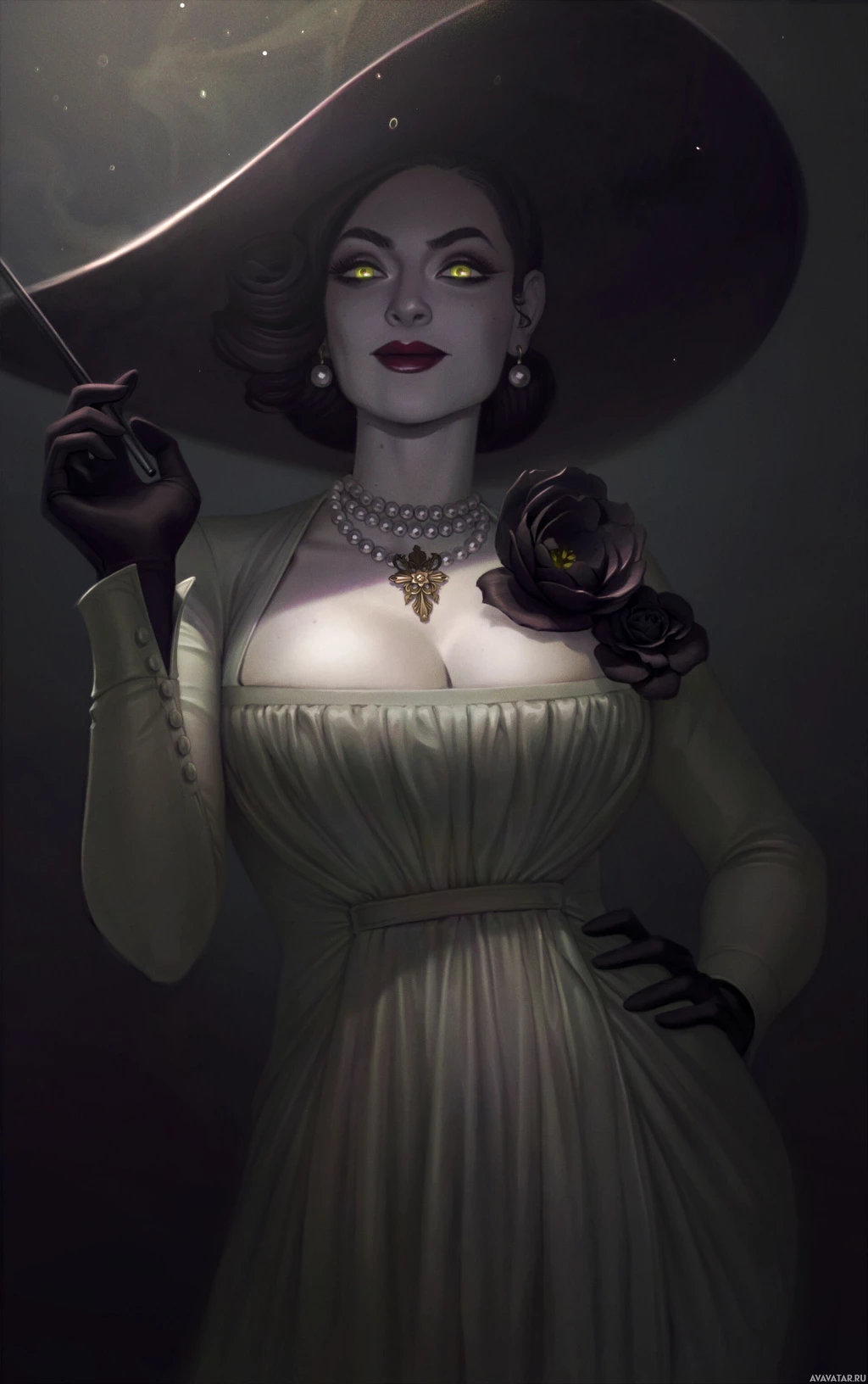 the video game "Resident Evil Village." She is depicted in an elegant and fashionable manner, wearing a wide-