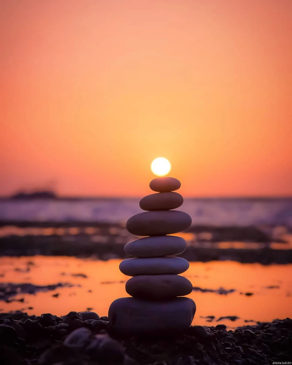 rocks at sunset or sunrise, with the sky transitioning from orange to pink. The stack has a symmetrical arrangement and appears to be on a beach or shoreline, given the presence of