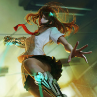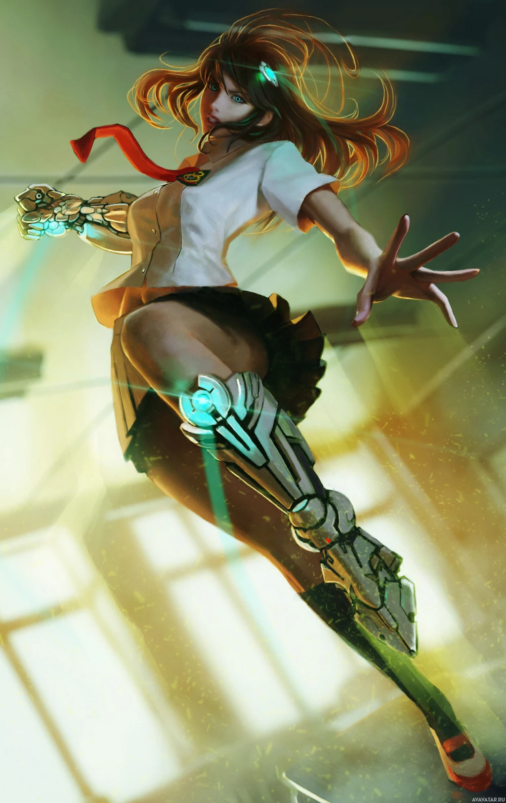 a school uniform and is wearing mechanical legs. Her pose suggests she is in mid-jump or movement, and she has her left hand extended, perhaps indicating that she is reaching for something or gesturing to someone out of the frame. The background appears to be an interior space with artificial lighting, which adds to
