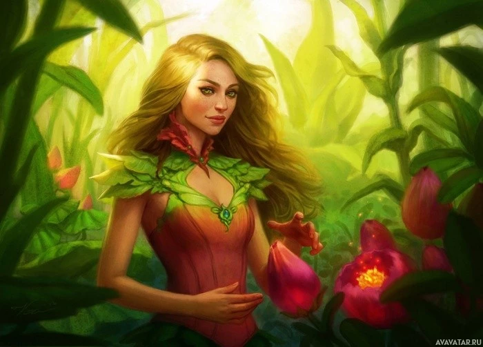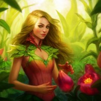 a female character with blonde hair, dressed in what appears to be a magical or fantastical costume. She is surrounded by lush vegetation that resembles
