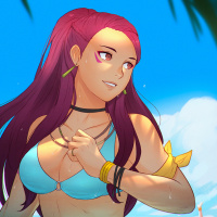 an animated character, a girl with pink hair, wearing a bikini and holding her hands together. She is sitting by the water's edge at what appears to be a tropical