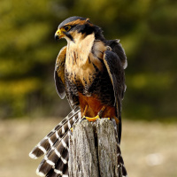 The image shows a peregrine falcon, which is a species of bird known for its speed and hunting skills. It's perched on top of what appears to be a wooden fence post with grass behind it. This bird has distinctive markings and is characterized by its pointed wings and long tails.